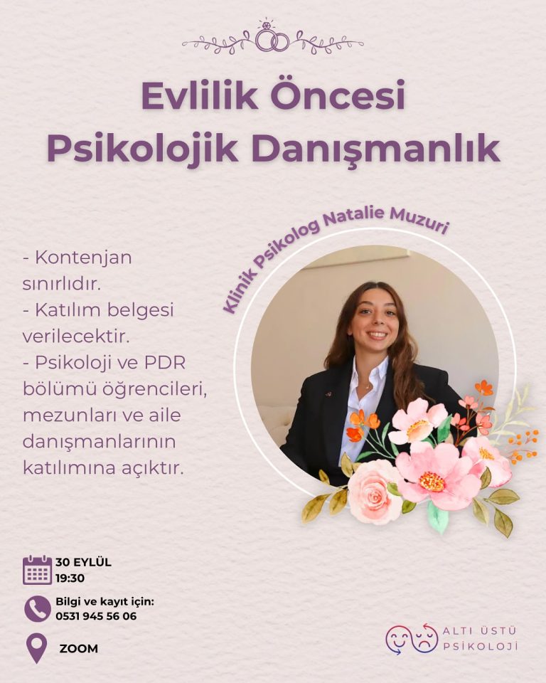 Klinik Psikolog Natalie Muzuri ile 30.09.2025 tarihinde Zoom üzerinden ”Evlilik Öncesi Psikoloik Danışma” adlı eğitimi gerçekleştirdik.✨ Eğitimde emeği geçenler: Hatice Rana Aktaş