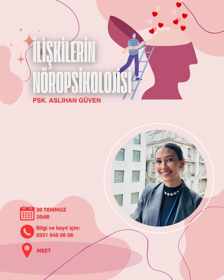 Psikolog Aslıhan Güven ile 30.07.2025 tarihinde Meet üzerinden ”İlişkilerin Nöropsikolojisi” adlı eğitimi gerçekleştirdik. 🫀 Eğitimde emeği geçenler: Azra İrem Toktaşır