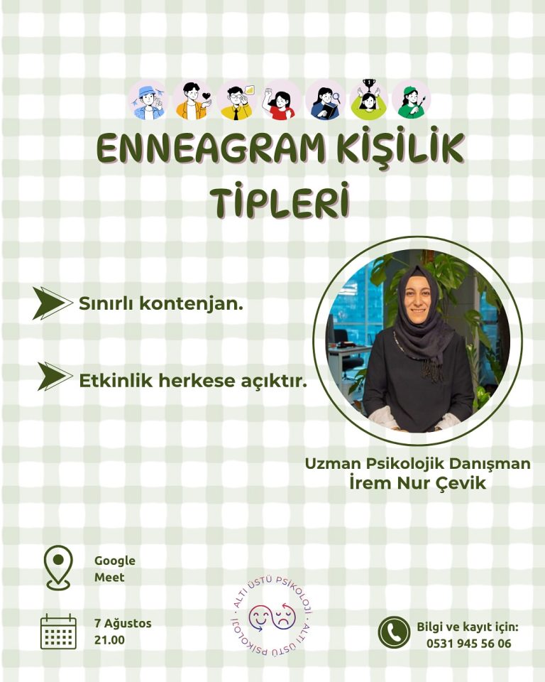 Psikolog İrem Nur Çevik ile 07.08.2025 tarihinde Meet üzerinden ”Ennegram Kişilik Tipleri” adlı eğitimi gerçekleştirdik. 🧠 Eğitimde emeği geçenler: Elif Rana Berk ve Sahra Sevim