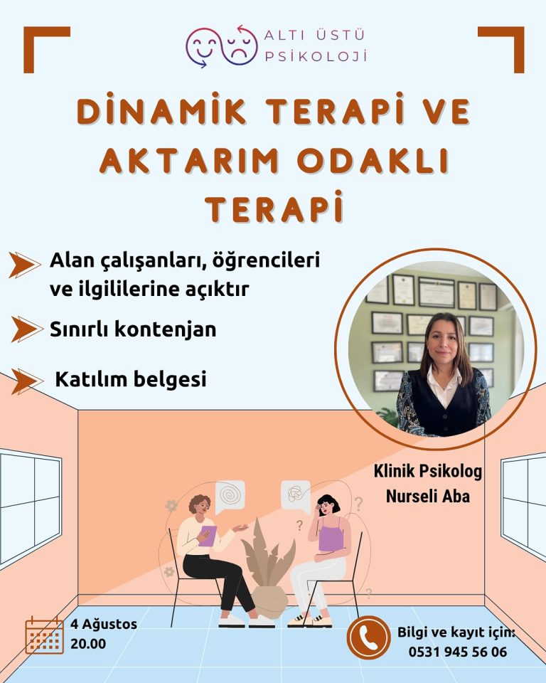 Uzman Klinik Psikolog Nurseli Aba ile 04.08.2025 tarihinde Meet üzerinden ”Dinamik Terapi ve Aktarım Odaklı Terapi” adlı eğitimi gerçekleştirdik. 💫 Eğitimde emeği geçenler: Azra İrem Toktaşır