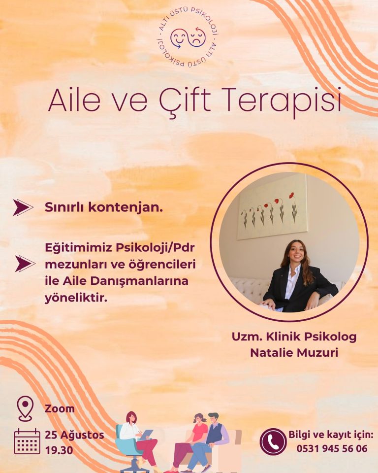 Uzman Klinik Psikolog Natalie Muzuri ile 25.08.2025 tarihinde Zoom üzerinden ”Aile ve Çift Terapisi” adlı eğitimi gerçekleştirdik. 🧸 Eğitimde emeği geçenler: Hatice Rana Aktaş