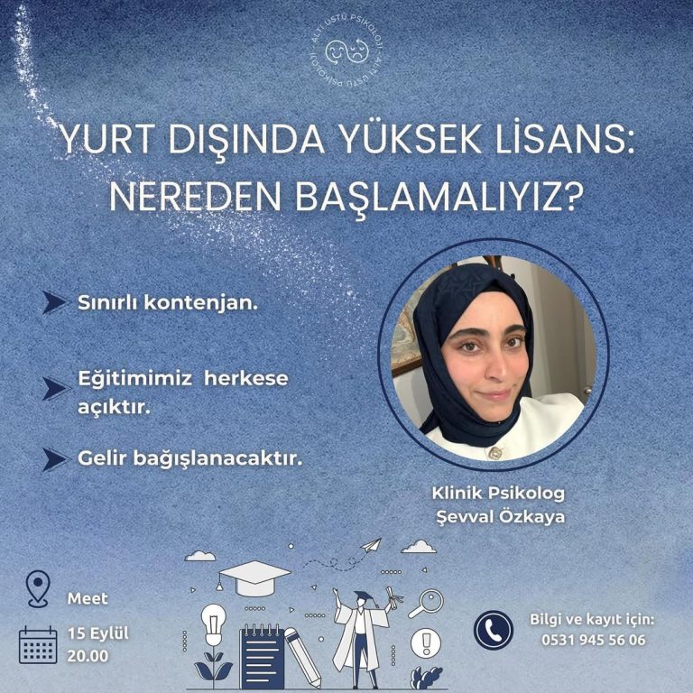 Klinik Psikolog Şevval Özkaya ile 15.09.2025 tarihinde Meet üzerinden ”Yurtdışı Yüksek Lisans: Nereden Başlamalıyız?” adlı eğitimi gerçekleştirdik. 🌎 Eğitimde emeği geçenler: Hatice Rana Aktaş