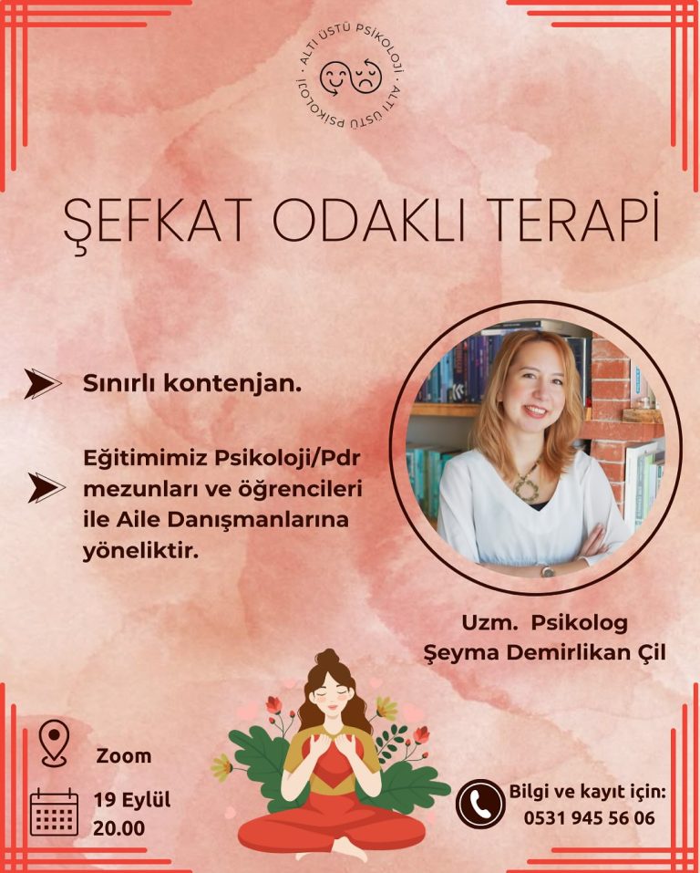 Uzman Psikolog Şeyma Demirlikan Çil ile 19.09.2025 tarihinde Zoom üzerinden ”Şefkat Odaklı Terapi” adlı eğitimi gerçekleştirdik.🫂 Eğitimde emeği geçenler: Hatice Rana Aktaş